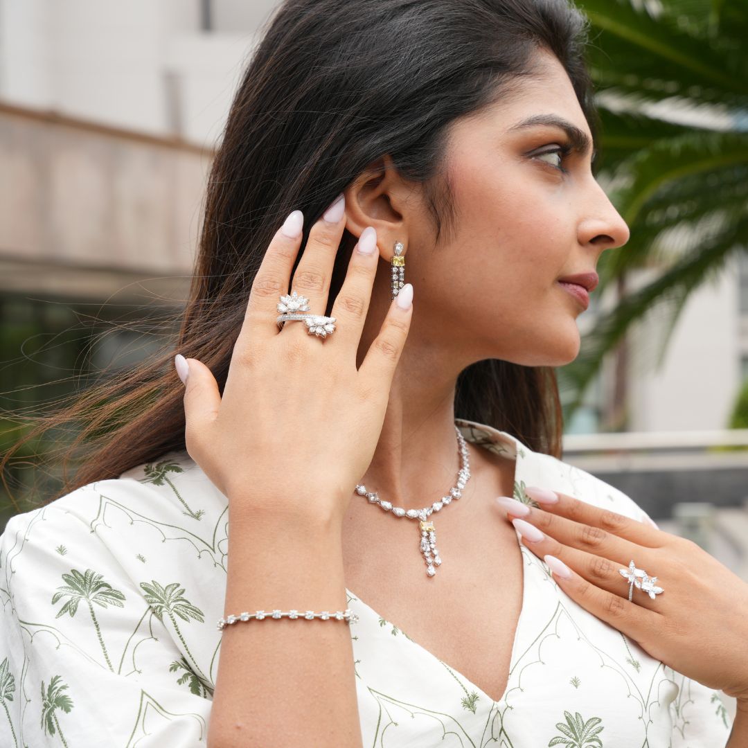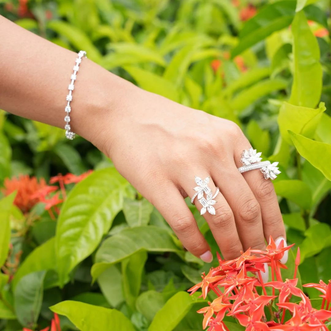 A garden of petals, adorned with sparkle and beauty set on a unique triangular shaped band.